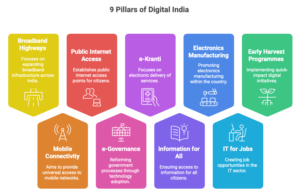Particularly, we mean the “Digital India” and “Make in India” programs. These initiatives are set to shift enterprises toward cloud, hybrid work, secure workflows, and other aspects of social life. Here are the key pillars of the Digital India program: