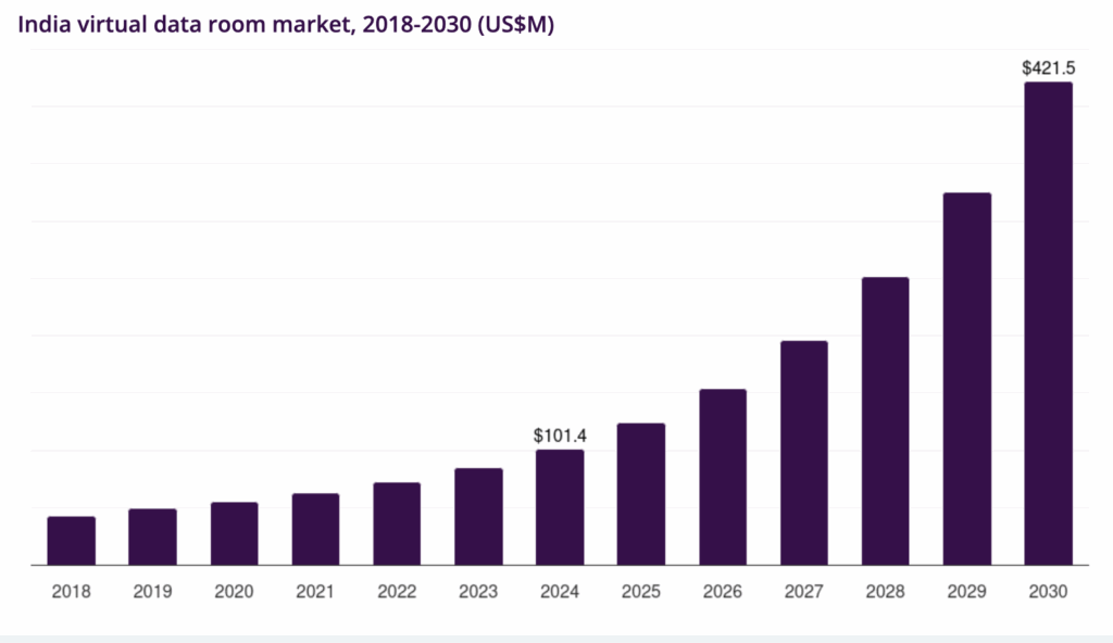 There are no current VDR adoption rates for the Indian market, as it still evolves. However, various market researches, such as this one from Grand View Research, point out that in 2025, more Indian companies are moving from ad-hoc document-sharing (email, file-shares) to dedicated secured platforms.